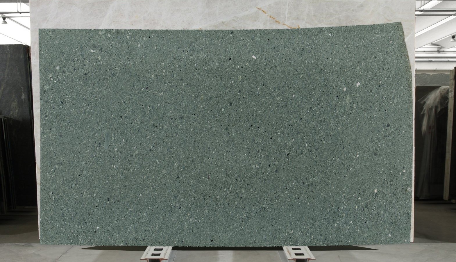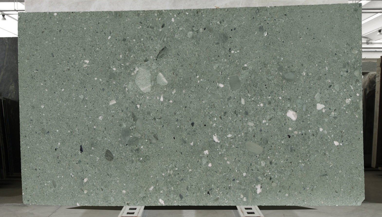 beeindruckt mit seiner ausdrucksstarken grünen Farbwelt und seiner außergewöhnlichen Struktur. Je nach Platte zeigt sich der Stein fein strukturiert oder mit markanten Ansammlungen größerer Gesteinsbrocken – jede Oberfläche erzählt ihre eigene Geschichte und macht jede Platte zu einem unverwechselbaren Unikat.